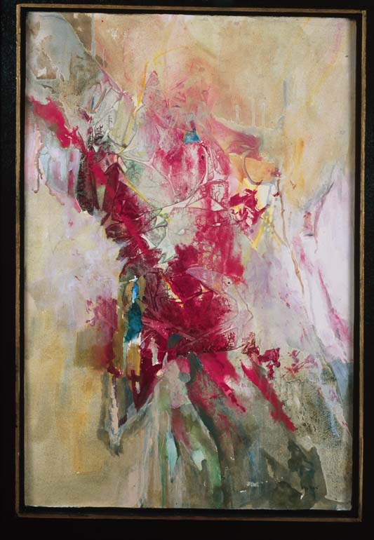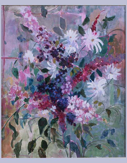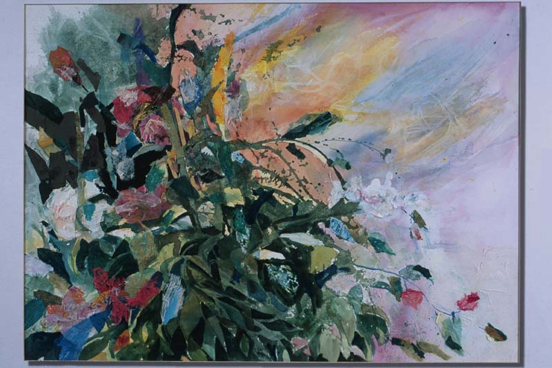 - Efflugence - Acrylic and Collage - 30W x 22L Impressionistic style floral on archival french paper $2000.00 Matted in Gold Frame.