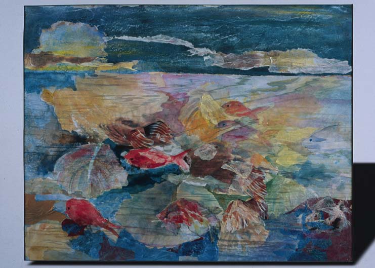 - Pisces Rising - Acrylic, Watercolor and collage 30X x 22L, Semi-abstract mixed media on archival french paper - Matted, Gold Frame $2000.00